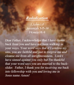 If you have already accepted Jesus as your Savior, but you are out of fellowship with God, there is forgiveness and restoration in Christ. The word of God says , “If we confess our sins, He is faithful and just to forgive us our sins and to cleanse us from all unrighteousness.” 1 John 1:9